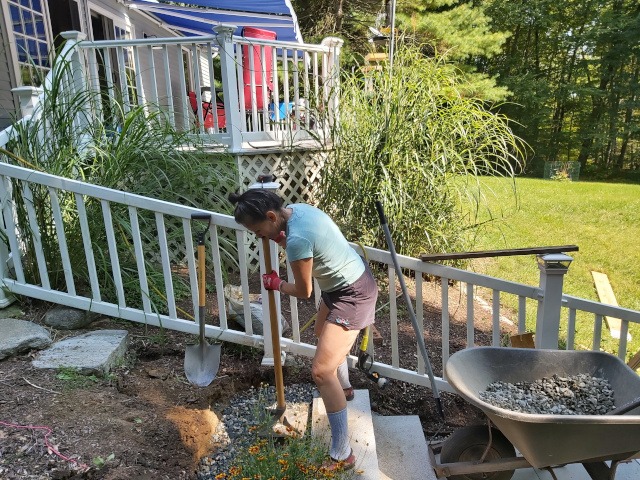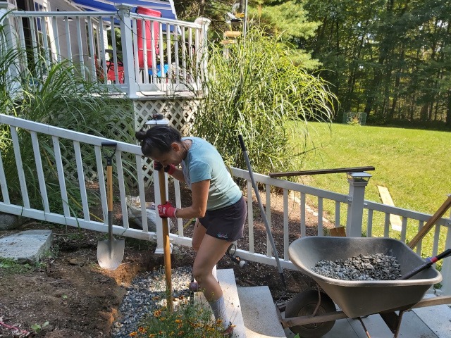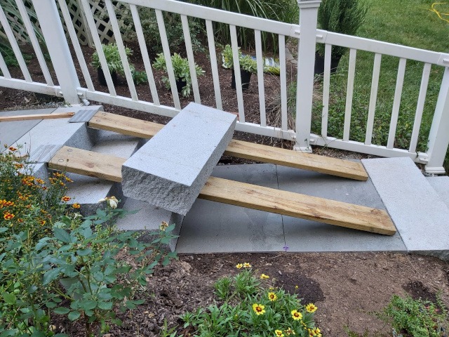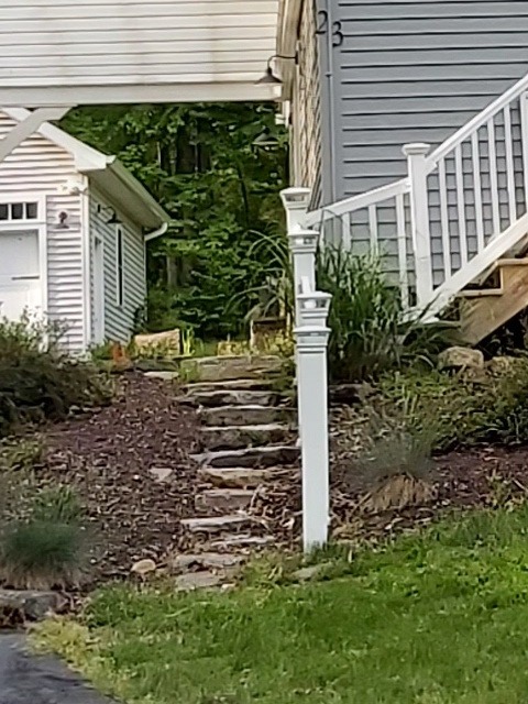 We bought nine blue stone pavers and ten granite steps. We started by digging a whole seven inches deep and filled with compacted crushed stone. When the crushed stone was leveled along the run and sloped to allow drainage into the garden (left side) we set the step. Then we dug out behind the step and compacted seven more inches of crushed stone. Basically, this process of digging, filling, compacting, and setting stones repeats until we reached the top. Then, every few steps we added a landing of blue stone pavers on a bed of seven inches of crushed stone. Therefore, the landings plus the seven steps cover the 15 feet of run and 49 inches of rise to reach the deck landing. From the deck landing we added a four-foot granite step to reach the deck steps and two granite steps to reach paradise patio.