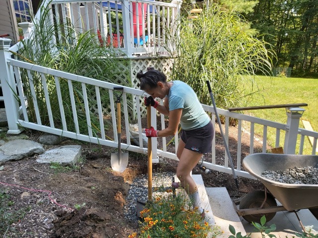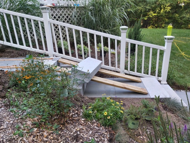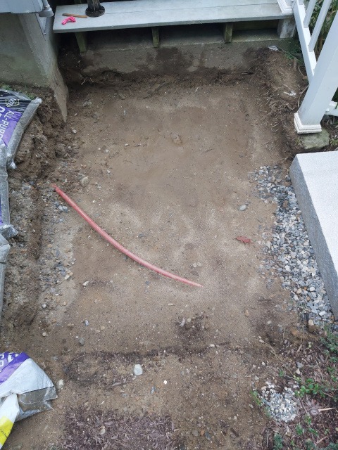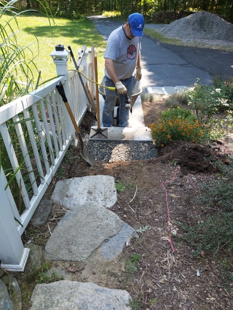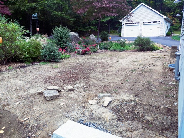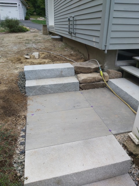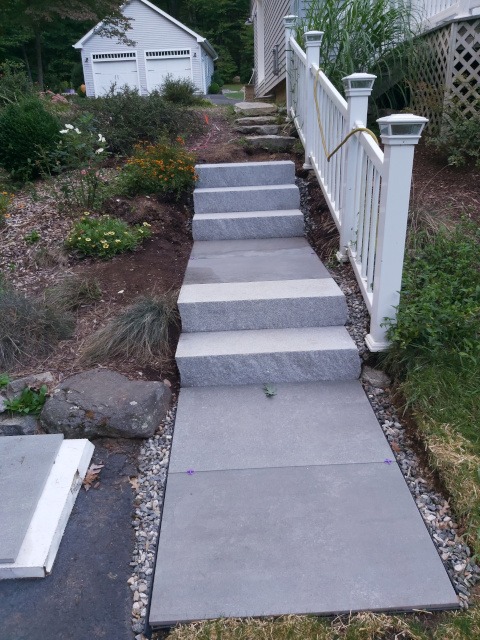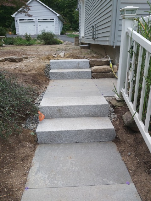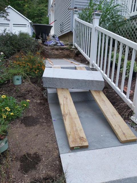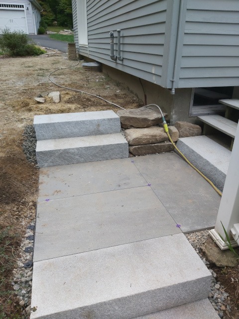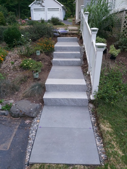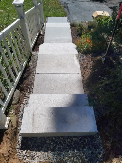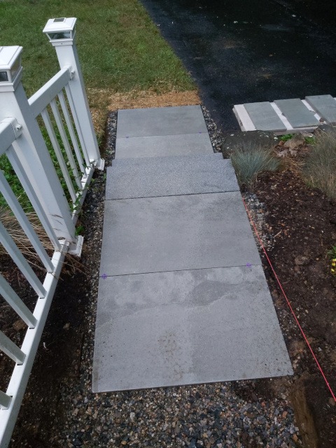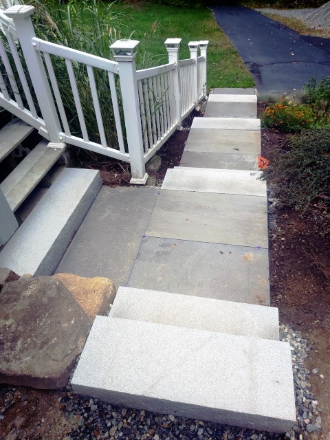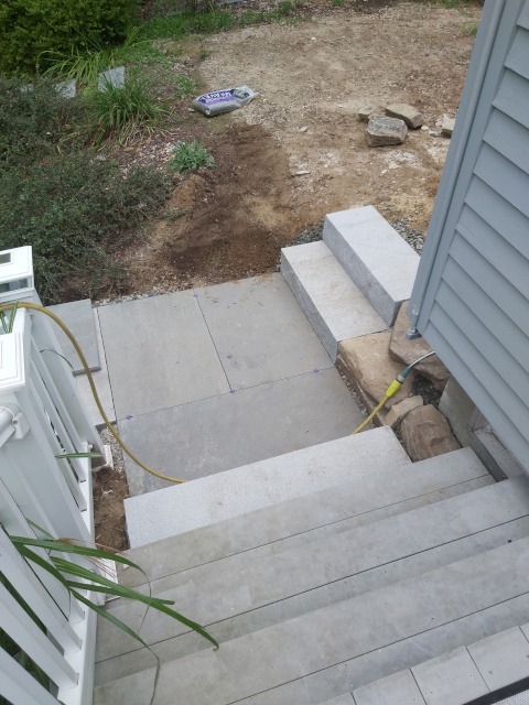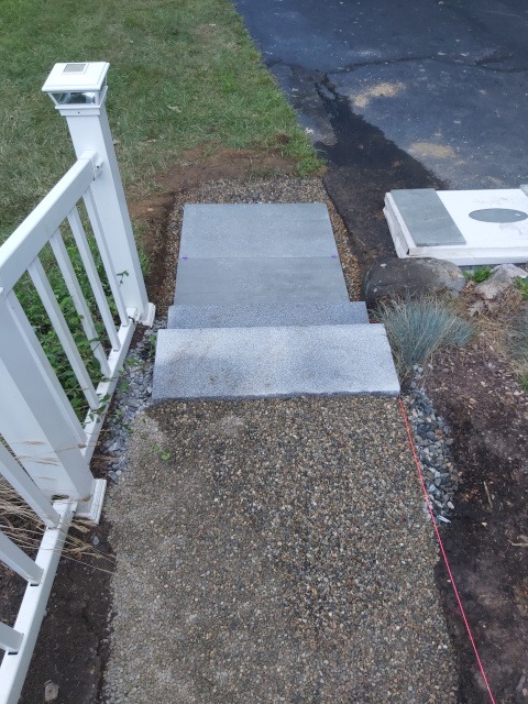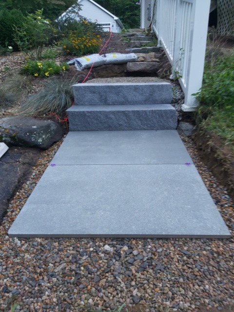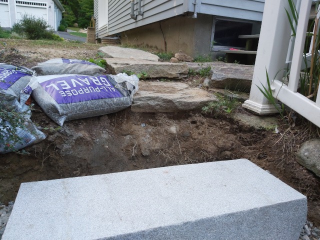 Kristina and I took a trip to a local granite distributer (Getty Granite). After that trip we decided on granite steps and blue stone pavers. Because the rise of the front garden required seven granite steps (seven inches tall) to reach the deck landing, but the run would have required 15 steps. Therefore, we needed landings. So, the plan was to use granite steps and blue stone pavers to cover the rise and run of the garden slope. This would require seven steps and two landings three feet wide by four feet long to reach the deck landing. Then two steps to reach paradise patio from the deck landing.