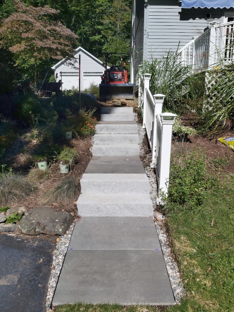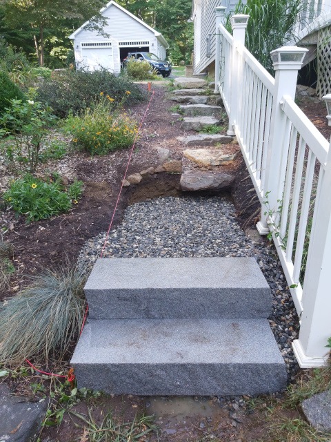 Well, the old garden steps left little to be desired. But don’t get me wrong they were quaint and were made from local field stone. But they were very difficult to walk on due to the difference in rise at every step. Not to mention the run of each step created an odd cadence. Therefore, Kristina and I wanted something made from natural material, safe, and easy to navigate. Here are the original steps and the new garden steps to Paradise Patio.