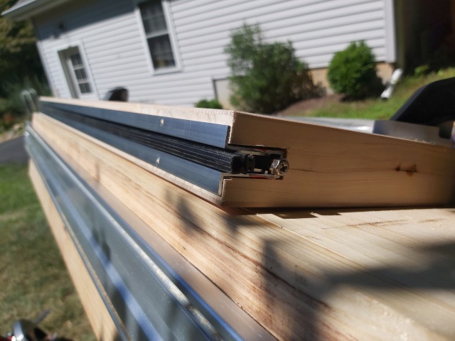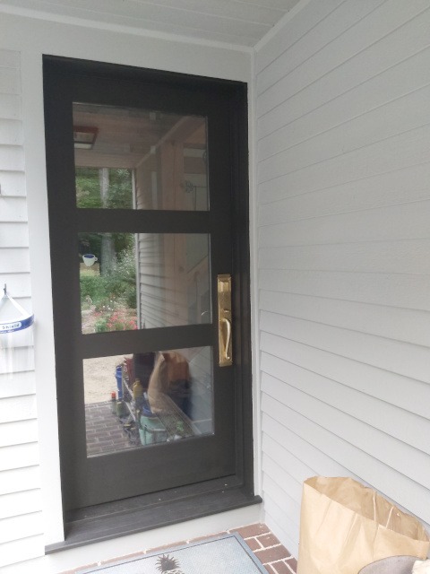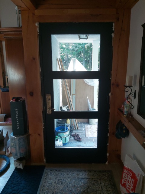 Now what do I do with this raw door slab. First, I read a bunch of how-to websites and watched a bunch of YouTube videos. Next, I pretended to be a carpenter and built a custom frame to fit the new door slab and rough opening. Then, Kristina and I picked out the door stain. Finally, I pretended to be a painter and stained all the pieces (all six sides of every piece). We wanted to allow circulation and light in, so we added a new screen too. The new screen door is an Anderson retractable screen door.