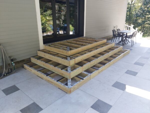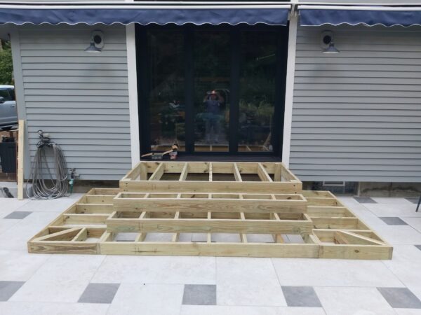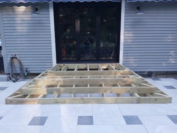 Our patio door is 25.5″ above the ground, we added one more step. Since we wanted the deck to be large enough for a karaoke stage we made the top of the stage four feet by eight feet. I decided to use box stringers for two reasons. The first because, I’m not a carpenter and the stage is freestanding. I figured the box stringers would give the stage better stability and would easier to build. But box stringers will require additional framing material. Here’s a few shots of the framing for our patio stage and cascading stairs.