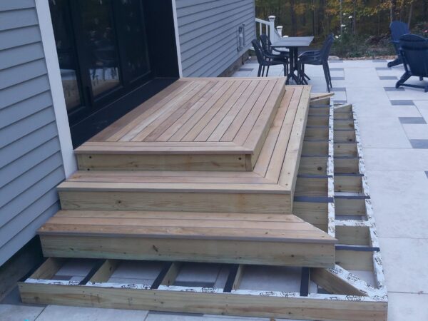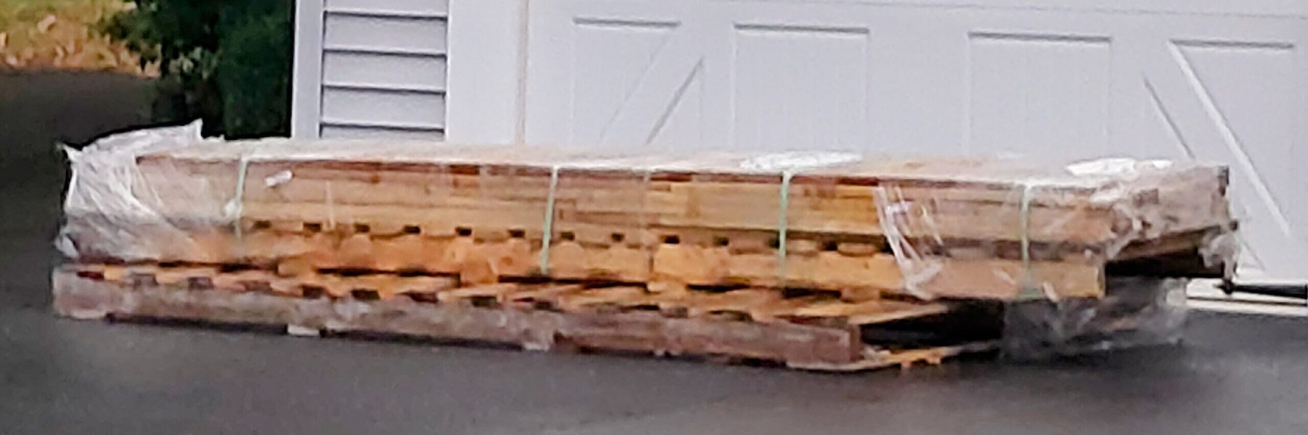 Selecting our decking material. We narrowed our options to ipe (or other Brazilian hardwood), composite decking or black locust (North American hardwood). We wanted real wood because composite decking cannot be recycled again and will end up in a land fill. After tons of research, we decided to use black locust. However, black locust is a North American hardwood that has rot and insect resistance similar to ipe. Because black Locust is a fast-growing tree that reaches maturity in about 30 years it is a sustainable wood product. We chose to buy our decking from Robi Decking. The Robi Decking website has a deck material calculator. Using the calculator we ordered 5/4″ x 4″ square edge deck boards. Then placed the order and a few days later we received the decking.