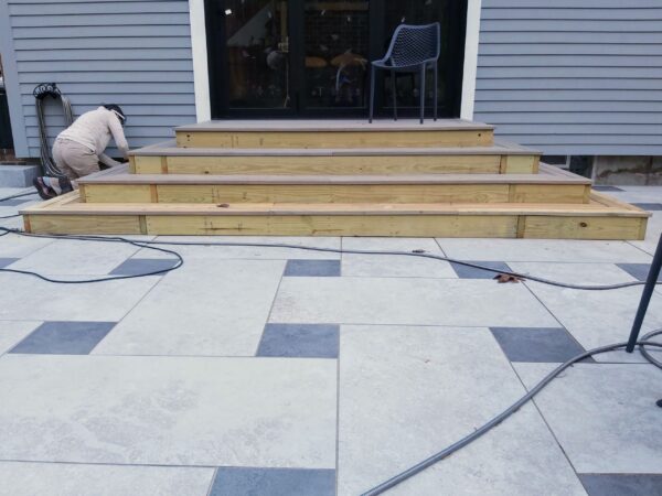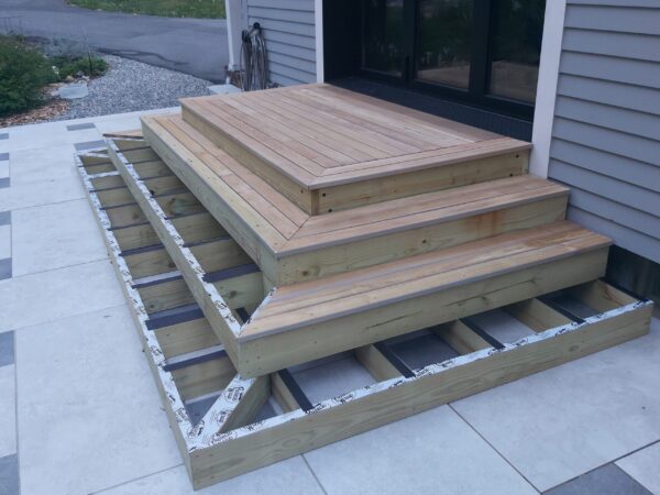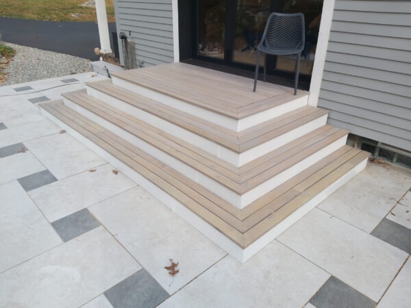 Although stain is optional for Black Locust we decided that we would stain our deck. Kristina’s design eye wanted a weathered grey look. Robi Decking sells a few oils and stains that are compatible with Black Locust. We chose Robi Patina Now Stain. Robi Patina Now gives the decking a protective coating and the silvery grey Kristina was looking for. So, we cleaned, lightly sanded, and stained the bottom and edges of every board before fastening the board down. After the boards were cut to fit we sealed the cut ends with Robi End Seal. Sealing the ends prevents checking of the end grain. Once the boards were installed, we cleaned, lightly sanded, and stained the tops of every board. Currently the deck is complete except for staining the last step. Kristina is currently sanding the last step and prepping for Robi Patina Now stain.