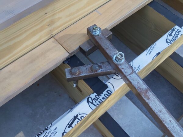 Black Locust is a fast growing hardwood and can have interesting grain patterns. However, this can cause bent boards. Although a few of our deck boards were bent and did required straightening. For straightening the boards I used a homemade bow wrench. I made my bow wrench in 2009. This tool holds the decking straight and tight to the spacers until fastened. Without a tool like this it can be hard to keep the boards straight and tight until screwed down. The tool can be reversed so it can push or pull the boards straight. In fact I have loaned the tool to friends building decks and they really like how fast it worked to straighten bent boards. I made mine for about 15 bucks but, nicer ones can be bought at places like Home Depot or Amazon. Here’s a few pictures.