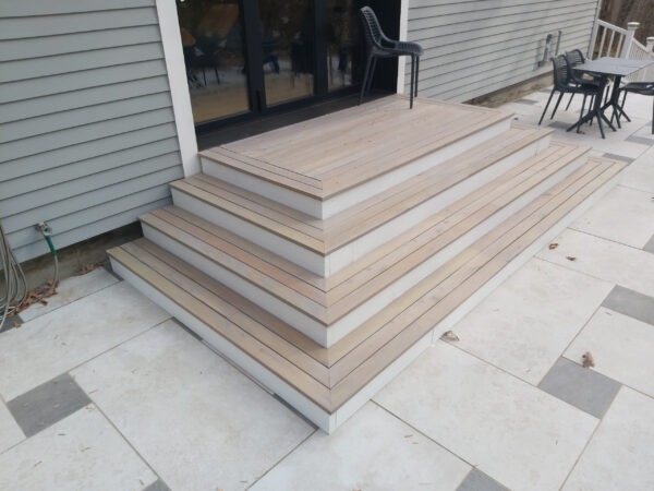 With the Patio Stage and Cascading Stairs built and stained there’s only one thing left. Well two things. One, stain the risers white. And two, enjoy it all with friends and family. I’m sure there will be many parties with Karaoke of course, so I bet the stage and patio will be well used. Many thanks to Kristina for researching eco friendly decking material, designing the Patio and Patio Stage with Cascading Stairs. I definitely couldn’t have thought of this all on my own. I’m not nearly creative enough. View the finished product below.