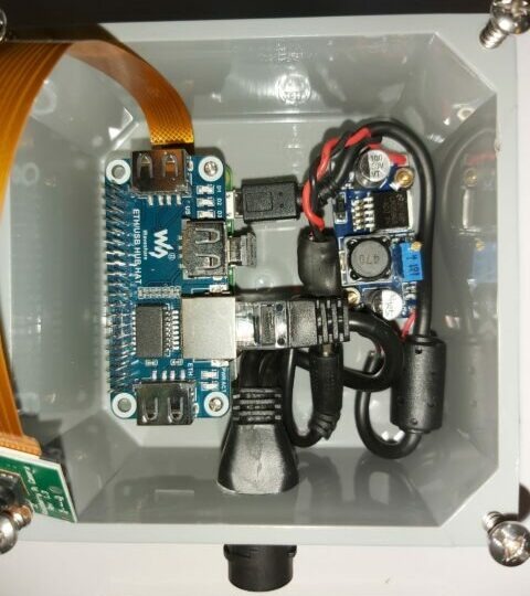 One of these splitters connects to your network switch and a power supply (12-24 volt wall adapter). The other splitter connects to the Raspberry Pi Zero ethernet port and a voltage regulator (set for 5.1 volts). Here’s a picture of all the components in the waterproof project box.